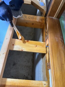 3. 断熱材の入れ替えと防虫処理: 床下には、高性能な断熱材を入れ直しました。これにより、冬の冷え込み対策にもなり、快適な室内環境を保てます。 そして、何よりも重要なのが、シロアリの再発を防ぐための防虫剤の塗布です。床下の木材に丁寧に薬剤を塗布し、お客様が今後も安心して暮らせるよう、しっかりと対策を施しました。