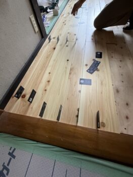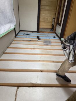 1. 被害箇所の根太(ネダ)交換: シロアリに侵食された根太を、新しい木材に部分的に交換しました。これにより、床の強度をしっかりと回復させることができました。