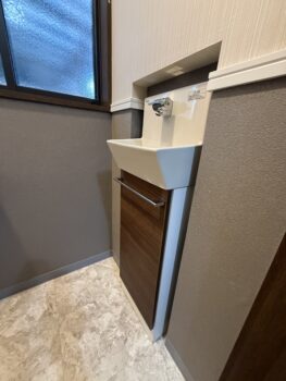 以前は壁から大きくせり出すタイプの手洗い器(画像1枚目)が設置されており、どうしても通路部分が狭く感じられていました。